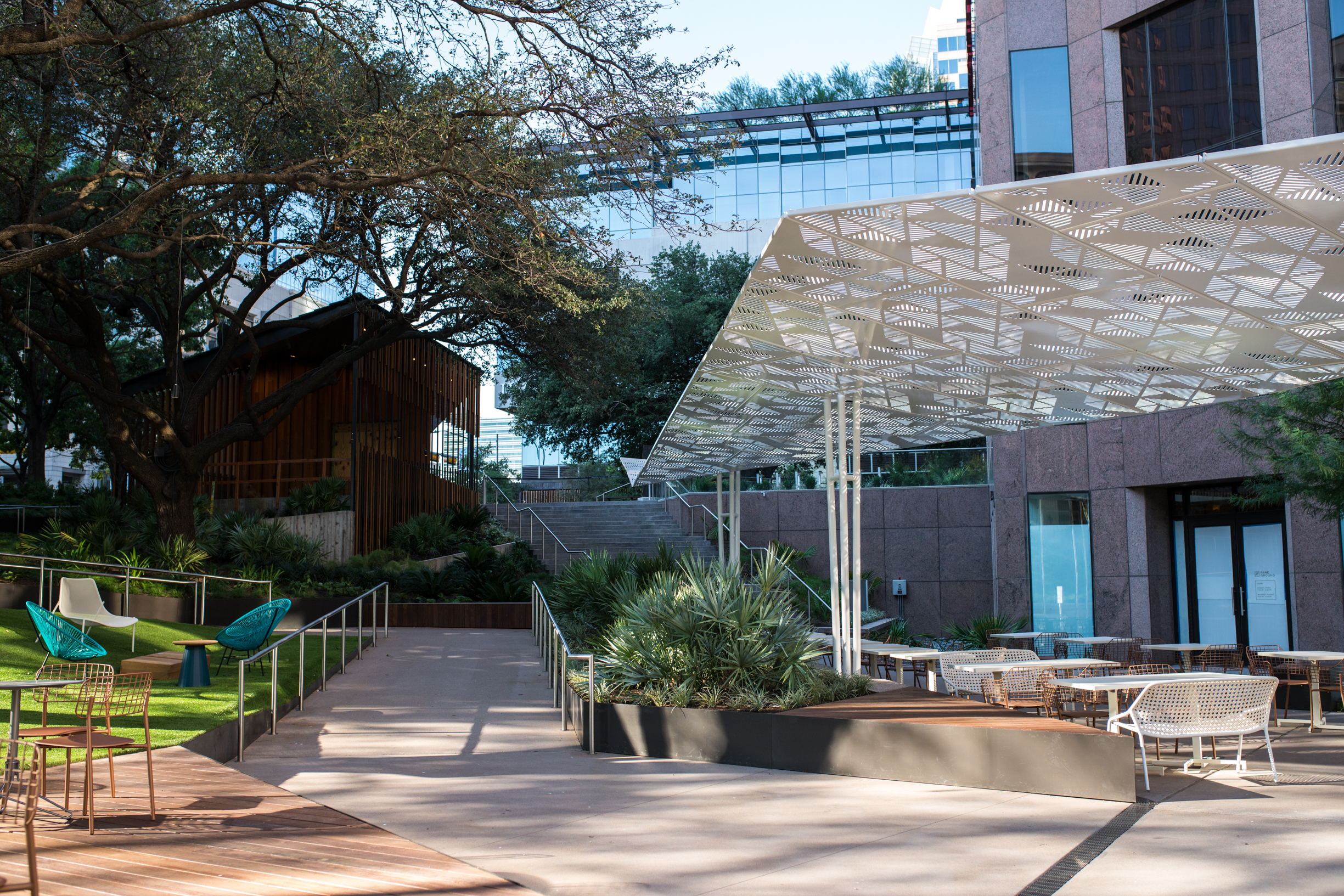 When national developer, Cousins Properties, decided to refresh their prime location at 111 Congress Tower, they engaged some of Austin's top design talent to renovate the Plaza and Lobby and to re-invigorate the building. What followed was nothing short of transformational! Featuring a sculptural shade canopy, over a thousand feet of stainless steel railings, plate steel retaining walls and more.